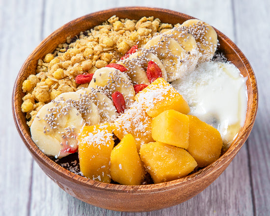 甘くてジューシーなマンゴーをトッピングしたアサイーボウル